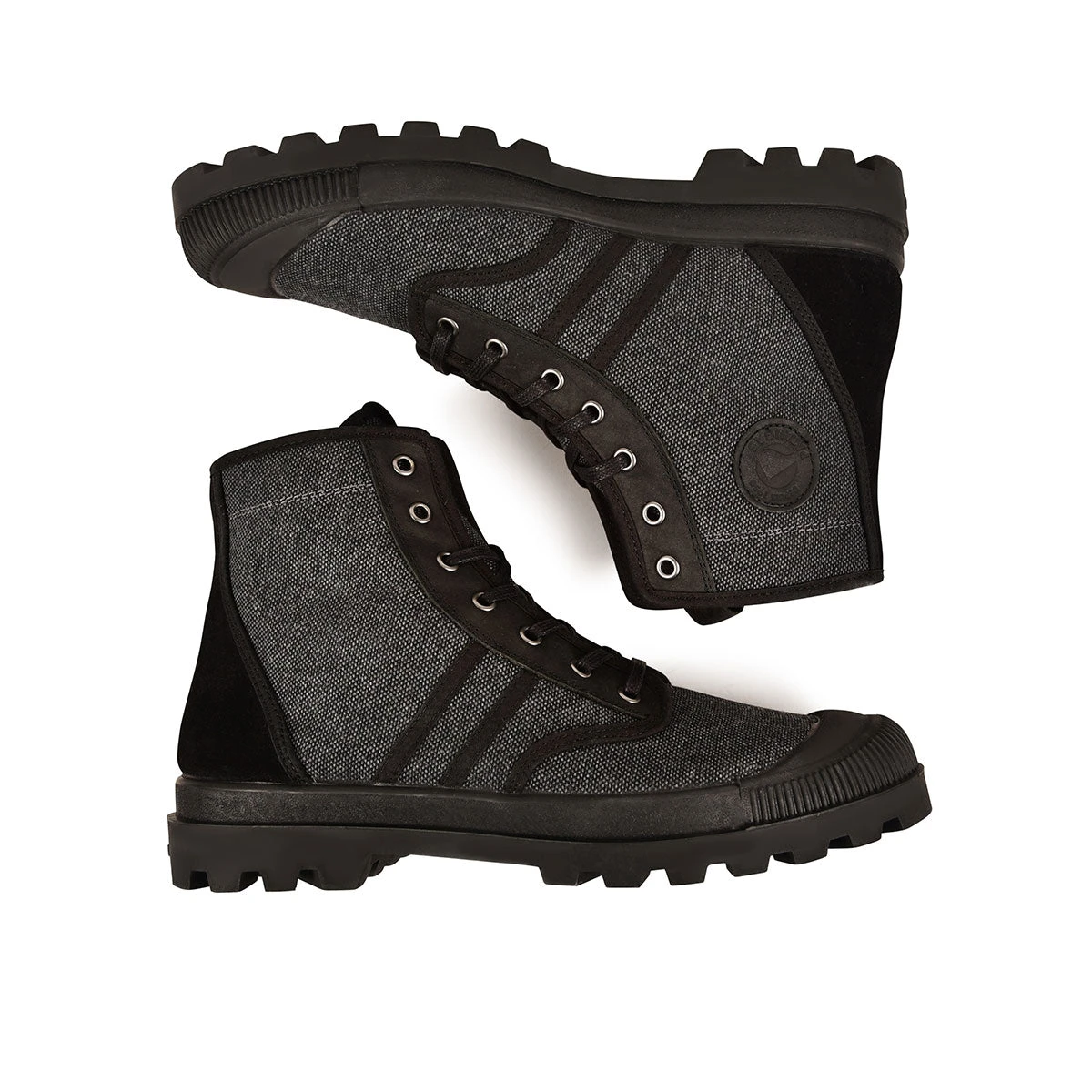 La boots pour homme en toile Authentique se pare cette saison d’un mix matiĂšres trĂšs Ă©lĂ©gant et sobre mixant les teintes noires. Cette boots est munie d’une tige en toile robuste et rĂ©sistante et est mixĂ©e avec des touches de cuirs et de suĂšde. Sa semelle crantĂ©e est en caoutchouc naturel et est trĂšs confortable.