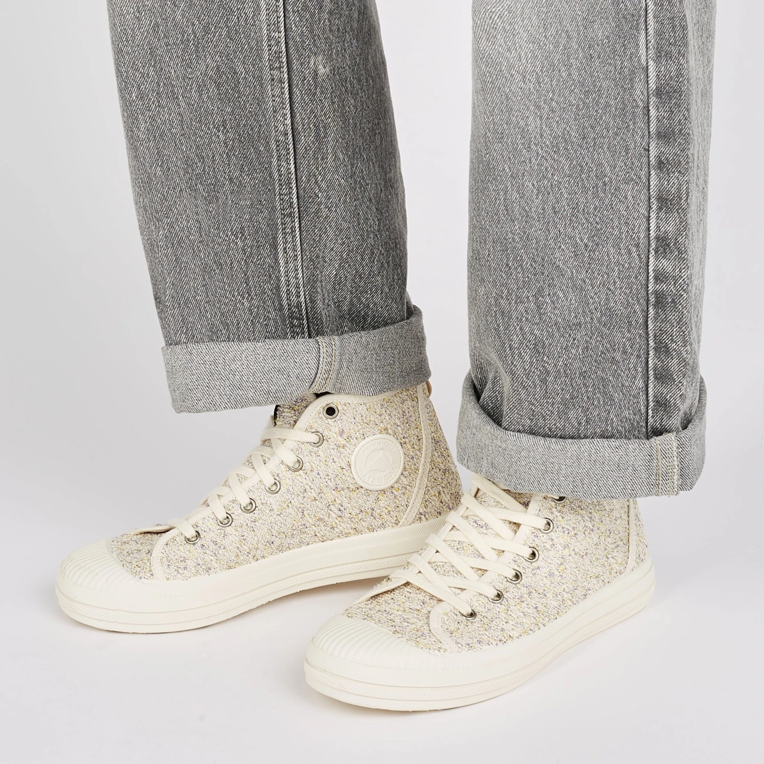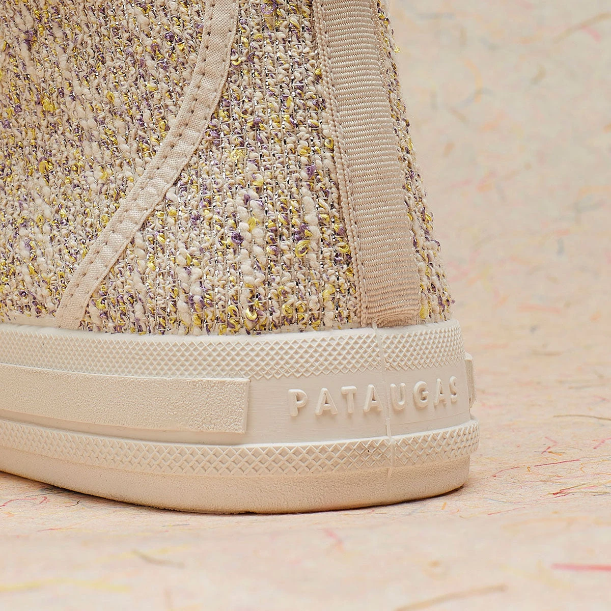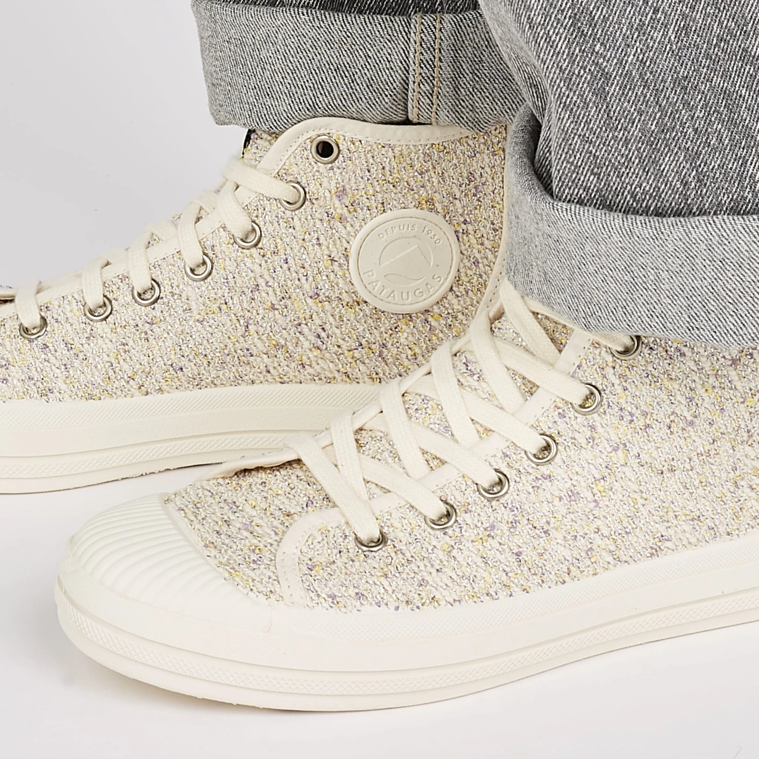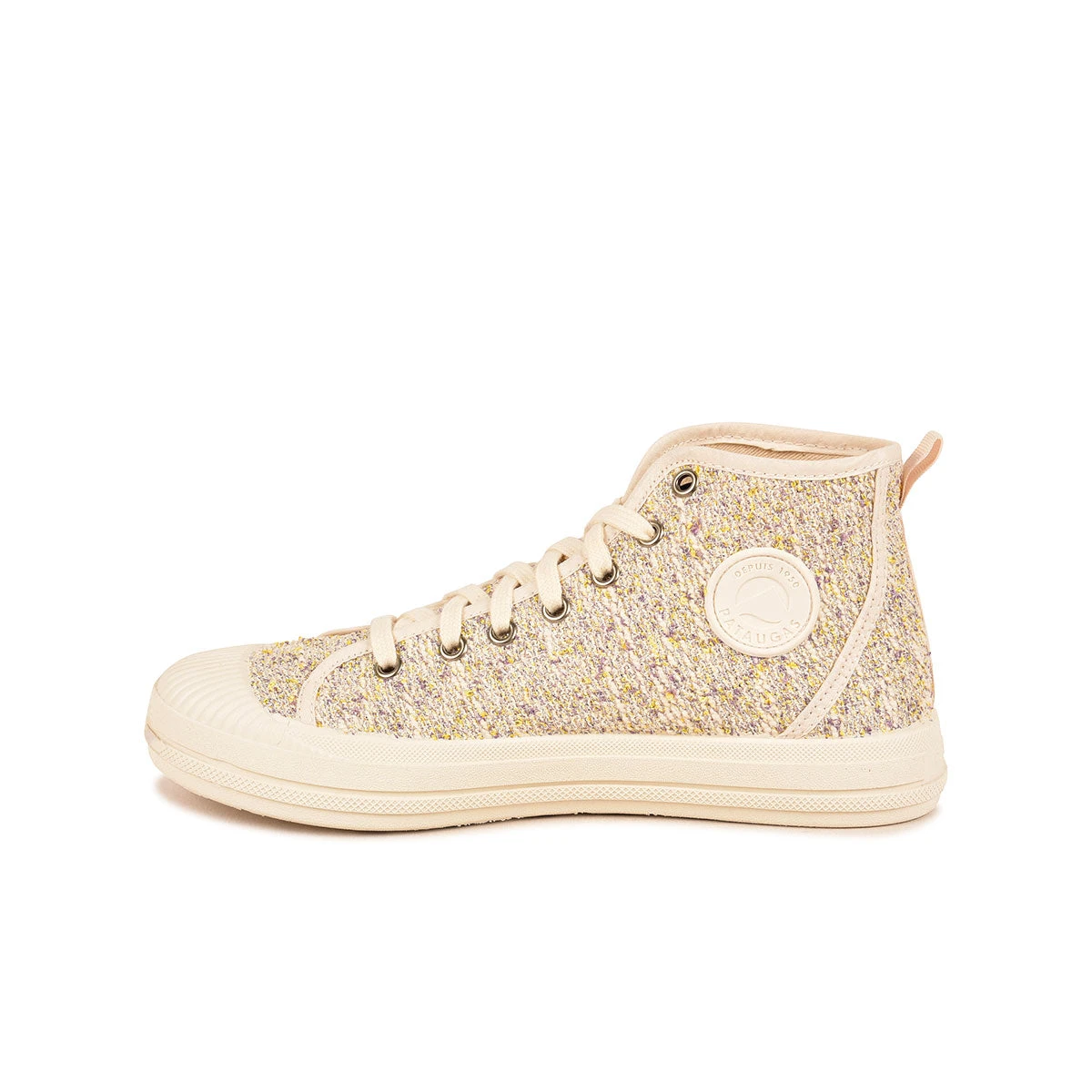 Découvrez notre basket femme ETCHE avec un tout nouveau tissus bouclette raffiné tissé en Espagne inspiré des codes du design et de l’ameublement, le jeu de fils multicolore délicat apporte douceur et sophistication couleur lilas. Cette basket en coton recyclé est très tendance, vous apportera confort et légèreté lors de vos balades estivales grâce à sa tige haute et sa semelle striée. Montée sur une semelle en caoutchouc naturel, permet à cette une basket d’être plus flexible et plus souple. Petit plus, sa semelle intérieure est amovible ce qui est très pratique si vous souhaitez y placer les vôtres.